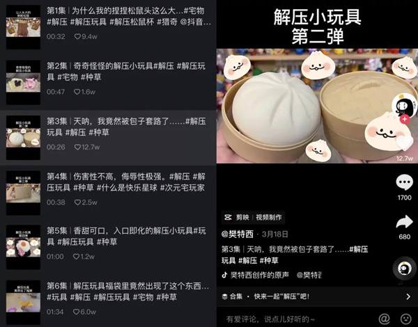 截至目前,他的“快来一起‘解压’吧!”系列视频已经更新了十集,每集的点赞数都在1万以上,流量最好的一条视频被点赞了12.7万次。