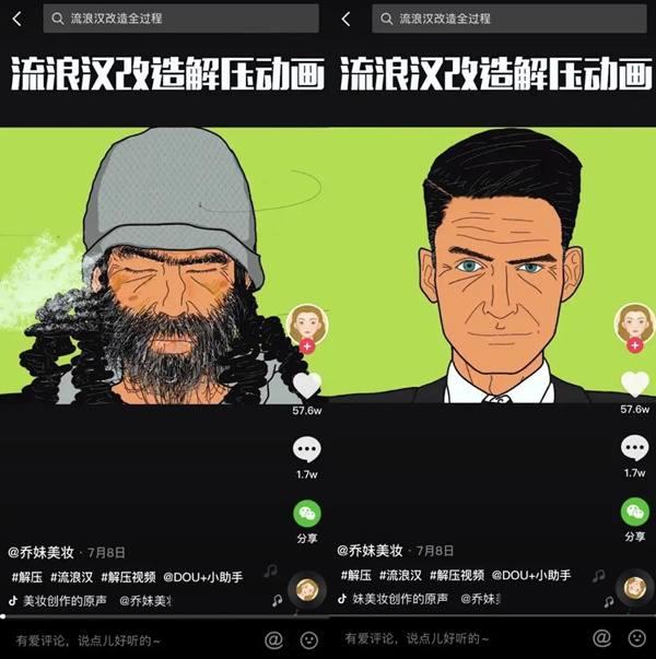 在解压视频领域,一些账号号主也会在发布视频时特地带上“强迫症”“逆袭”“减压”等标签,这些视频中,包含着切沙子、切水果、给其貌不扬的人物进行改造打扮等内容。