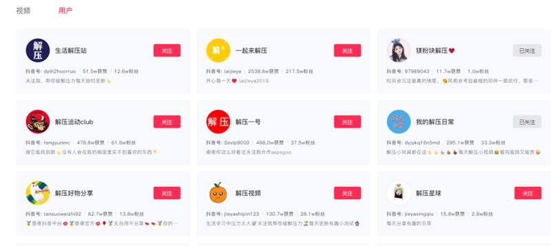 解压视频的流量虽高,但账号的粉丝数却并不多。以“解压”为关键词在抖音上进行搜索,结果显示,大部分解压账号的粉丝数都在10万至100万之间,拥有100万粉以上的账号寥寥无几。