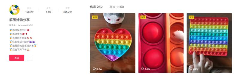 据新榜观察,目前解压视频号主的变现方式主要有以下几种:引流电商店铺、抖音橱窗卖货,以及视频广告植入。如果是卖货,货品通常与解压视频**现的道具高度相似。