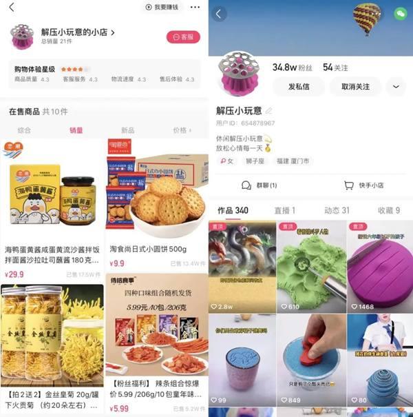 与“圆子slime”的店铺商品相比,快手账号“解压小玩意”的小店销售货品更加多元化一些。除了和视频内容相关的太空沙,小店还销售日式小圆饼、辣条组合装等零食。其中,一款“海鸭蛋黄酱”单瓶售价29.9元,目前已售出17.5万件,总销量达到500万以上。