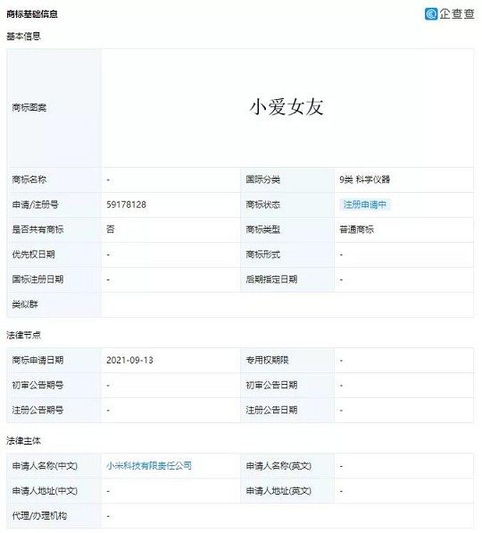据爆料,小米科技有限责任公司正在申请注册“小爱女友”商标,分类为科学仪器,目前的状态为申请中
