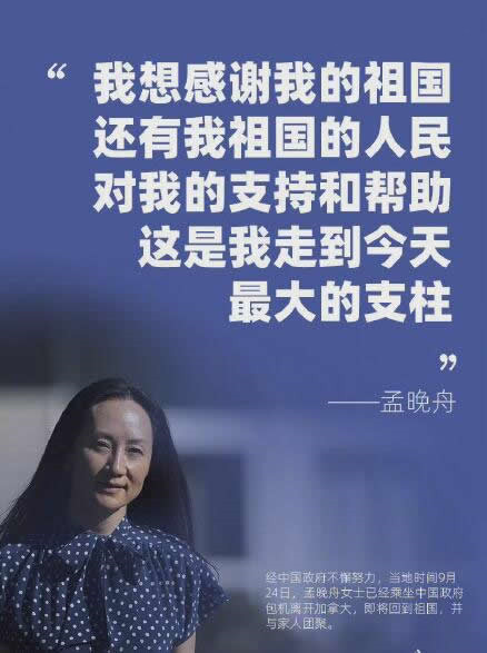 获释后孟晚舟发表简短演讲,在演讲的最后,她说:“我想感谢我的祖国和祖国人民对我的支持和帮助,这是我走到今天最大的支柱!”